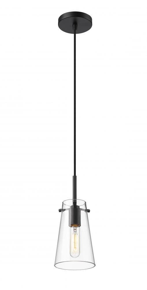 Clear glass defines a slim silhouette, bringing refined style to a modern one-light pendant. Its stately matte black finish sets the tone for a refined living space, kitchen or powder room. The gentle tapering cone silhouette of the pendant ensures its timeless look, perfect alone or in series lighting a larger space.