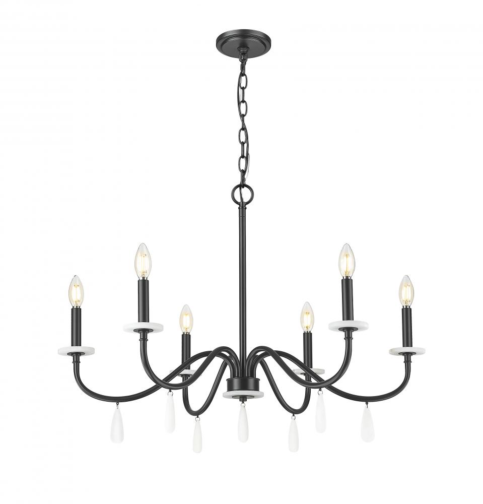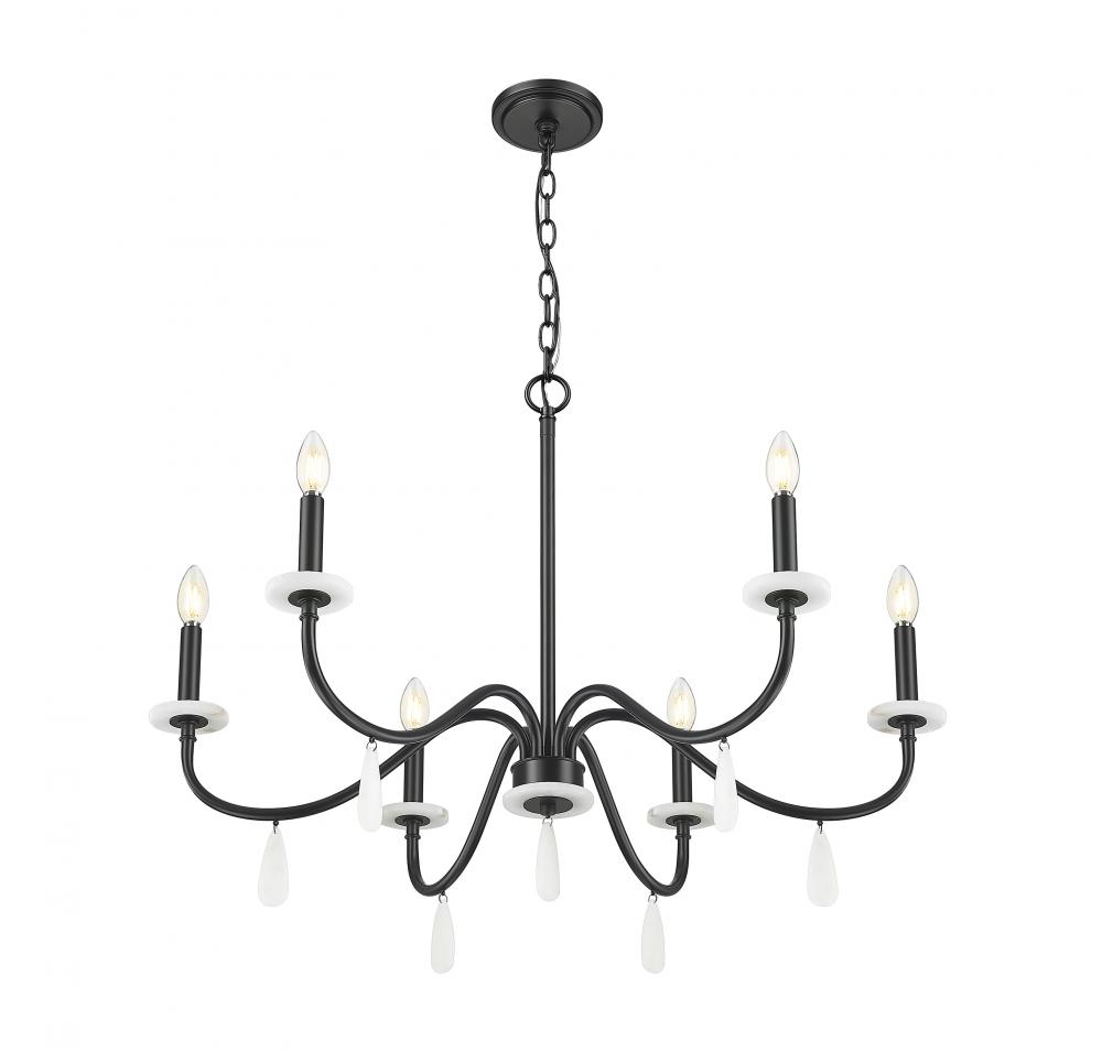 Romantic candle sleeve holders infuse a sense of romance to this elegant six-light chandelier, a superb source of illumination perfect for dining rooms, living rooms, and foyers. Follow the gentle curves of matte black finish steel arms with alabaster boboches making an impact, with artisan droplets sparkling below. This dimmable fixture adjusts light levels to suit time-of-day conditions.