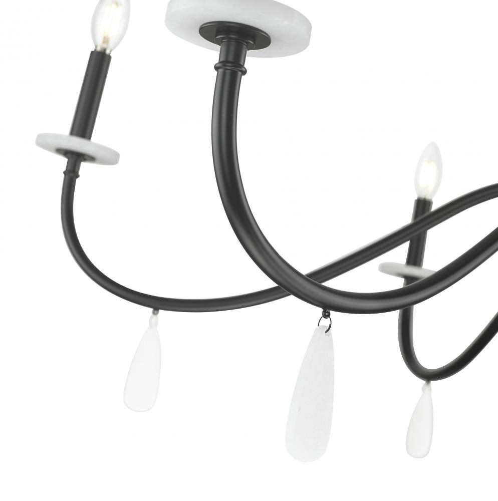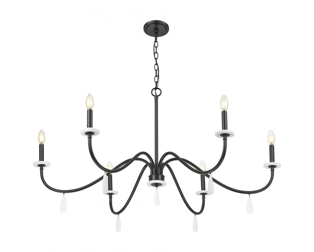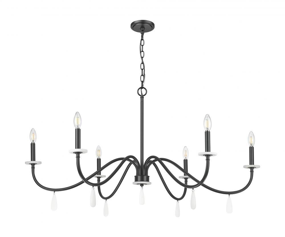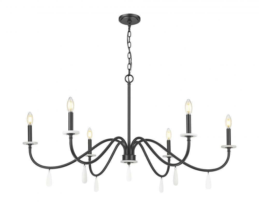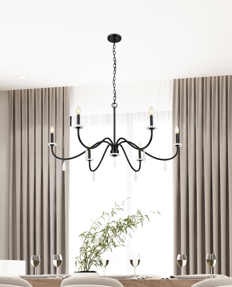 Smooth style is at once sophisticated and versatile in a timeless six-light chandelier youll want to consider. Matte black finish steel framing features gently curved arms holding decorative boboches and chic sleeves, with artisan drops catching light as it flows below. This dimmable light fixture offers varying light levels for mood illumination.