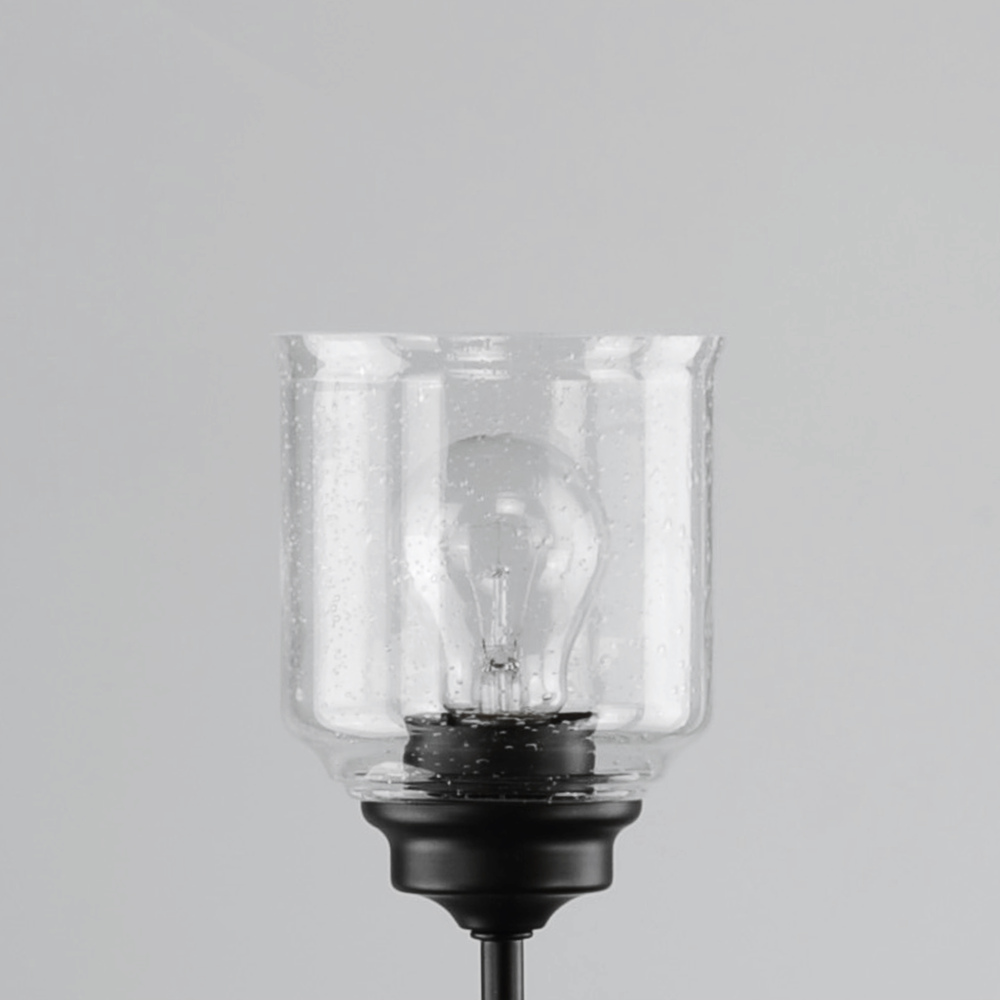 A modest frame of steel tubing gently bends to support a cluster of Clear Seedy bell-shaped glass. Similarly the bobeches and other metal accents echo that traditional bell shape creating an instant classic. An easy choice with transitional appeal, choose