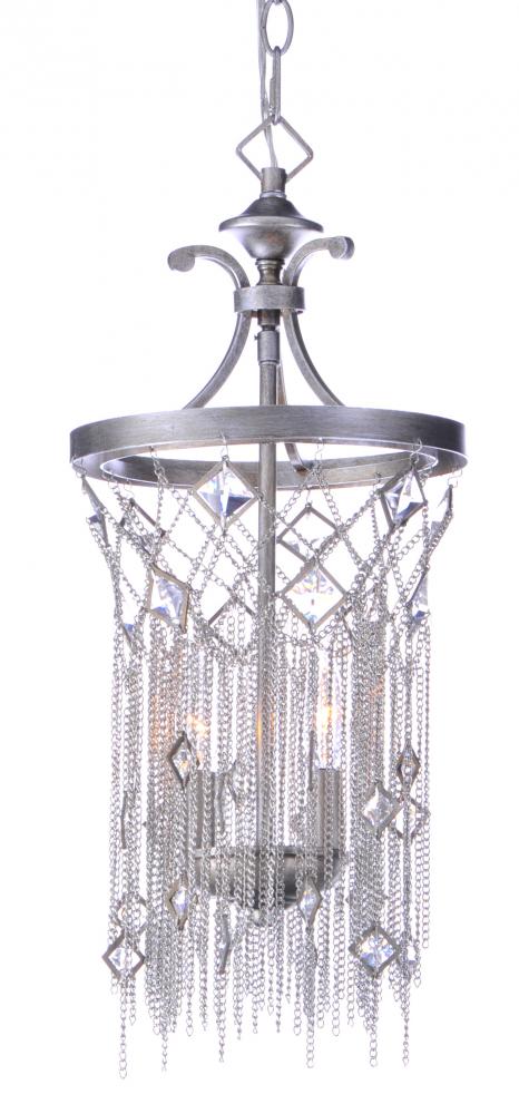 Diamond shape crystals float in a web of jewelry grade chain supported by a metal frame finished in in our exotic Silver Mist. Each fixture is delicately draped by hand from skilled artisans to create these original lighting art forms.