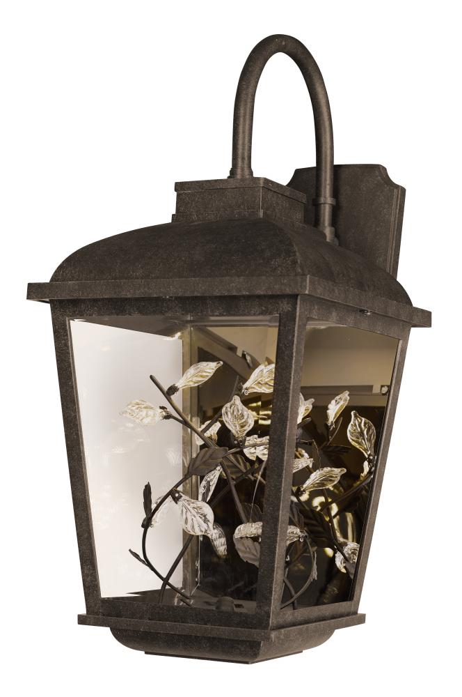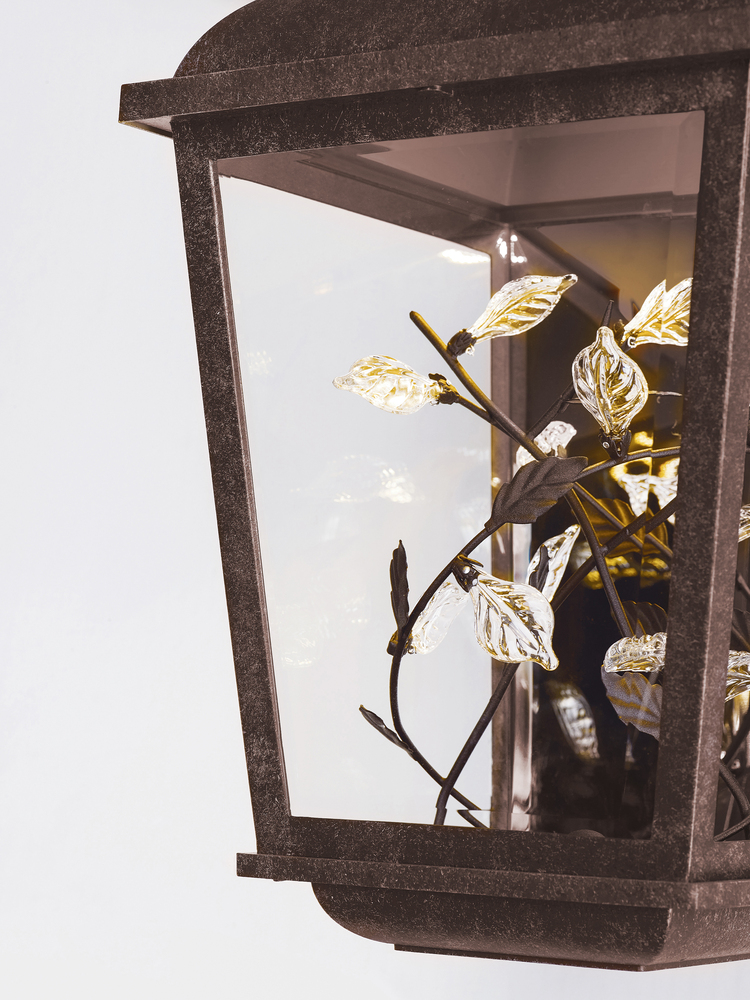 A sculpture of metal and Clear crystal leaves come to life while illuminated from above with a powerful LED light source. The cast aluminum frame painted in our popular Adobe finish compliments the theme and the polished back plate gives the sculpture a u