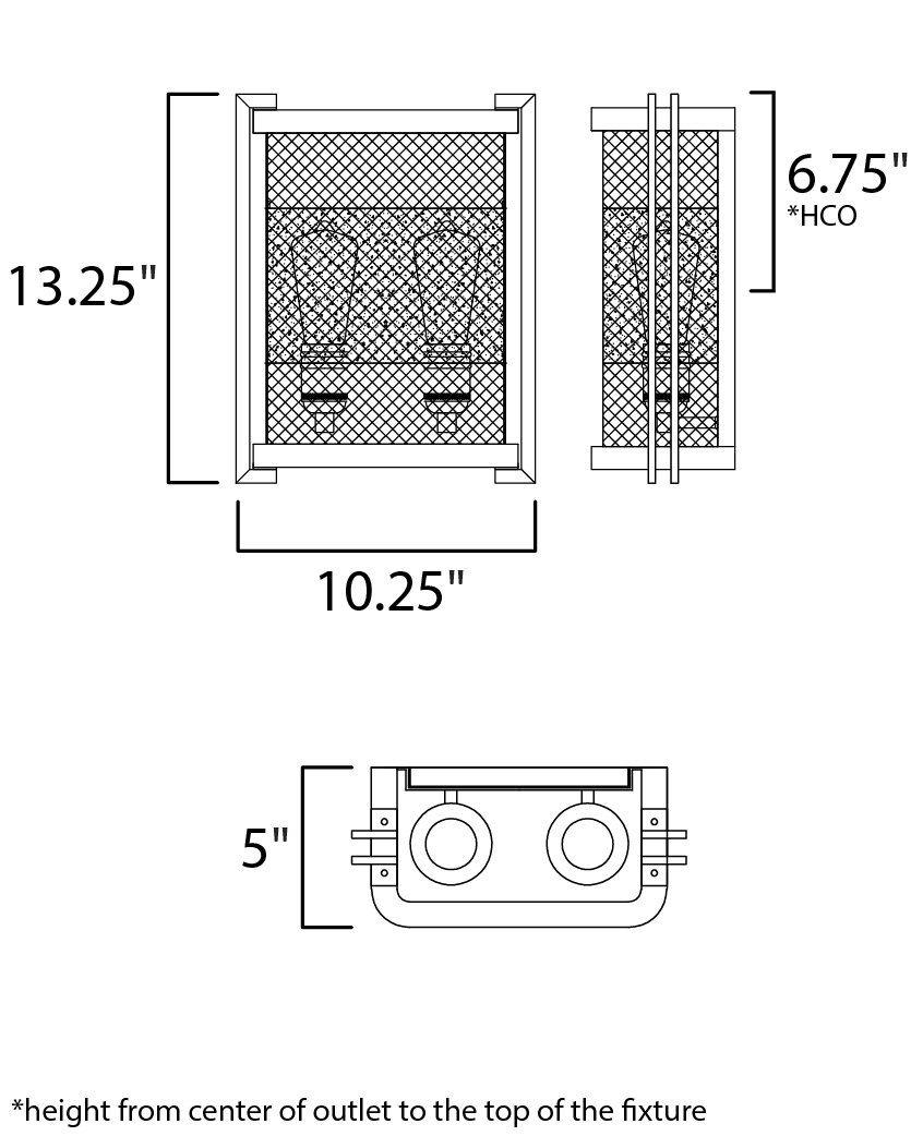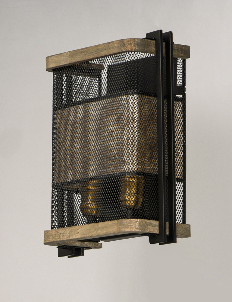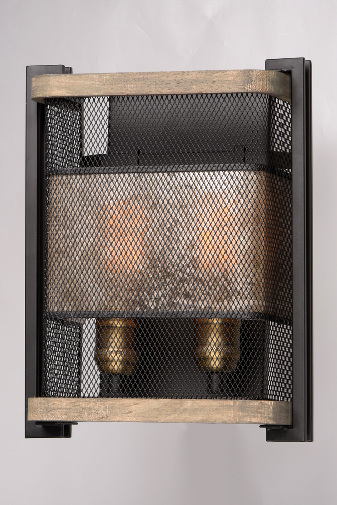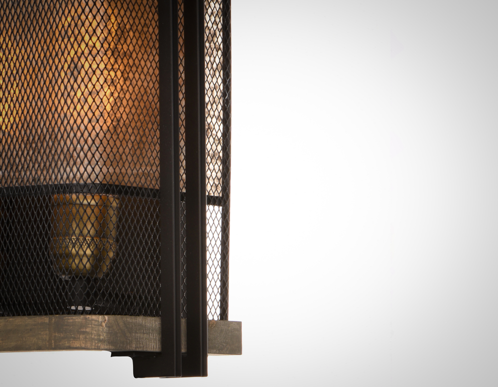 Frames of wood finished in Barn Wood and cradled by Black metal brackets were used to create this beautiful rustic design. The Black mesh screen is accented with a band of mica and Antique Brass sockets to deliver rustic charm with all the right fixings.