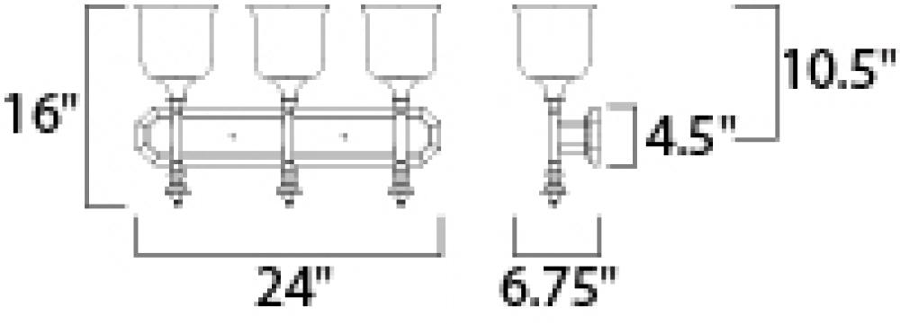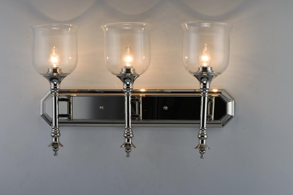 Traditional fonts of Polished Nickel support Clear glass shades reminiscent of Colonial times. This ageless design has upscale appeal at an attractive price.