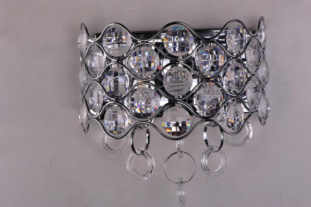 Chains of faceted crystal rings are linked together by Polished Chrome jewelry bands that cascade from the top and through the fixture. The exterior shade of wave-like metal encases multi-faceted Beveled Crystal jewels, which sparkle from the light of the