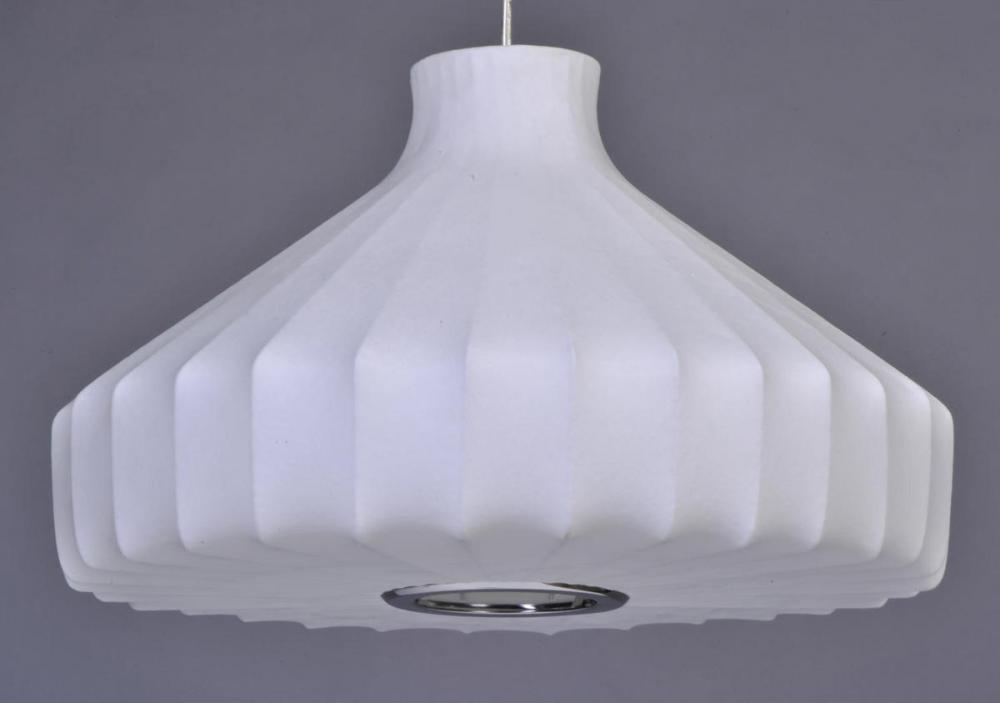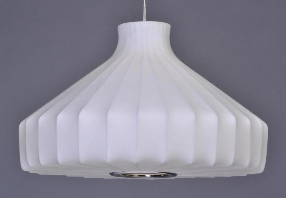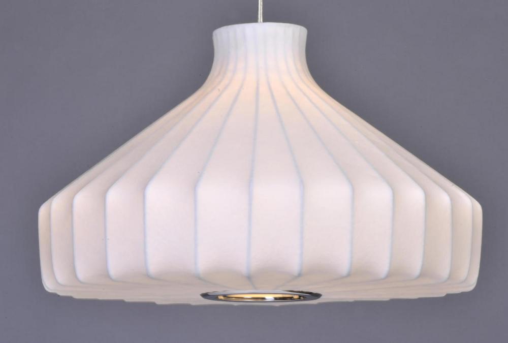 A web of fiberglass Is bonded together with latex and stretched over steel frames, creating a 5O's contemporary design. When illuminated, the fiber shows through the soft fabric and adds texture to this unique look.