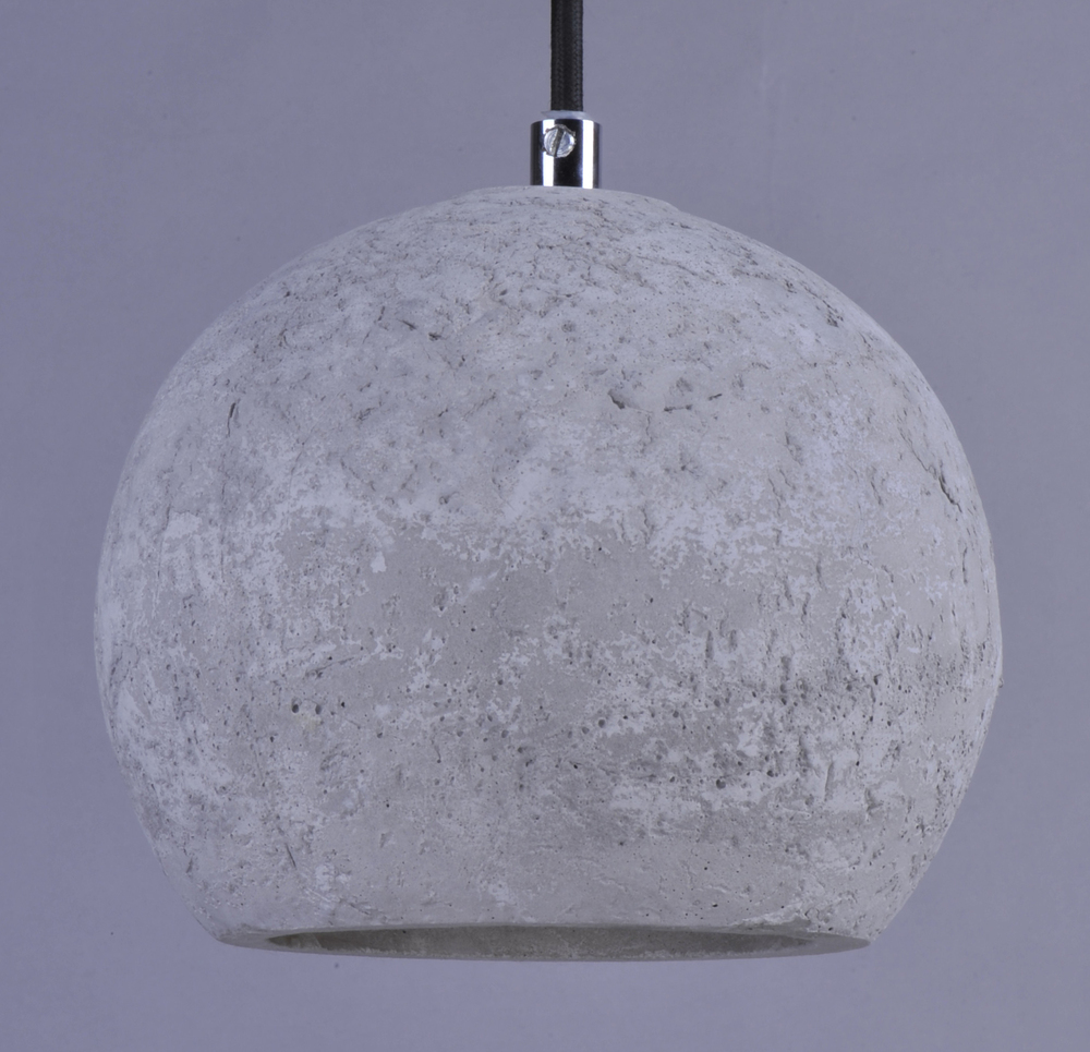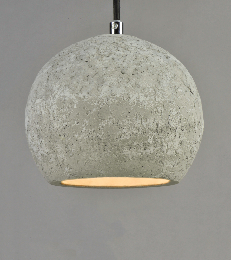 Pendants molded in natural Gray finish concrete cement provide a unique urban contemporary design element Metal Polished Chrome hardware contrasts beautifully with the black fabric covered wire. Powerful and efficient illumination is provided by included G