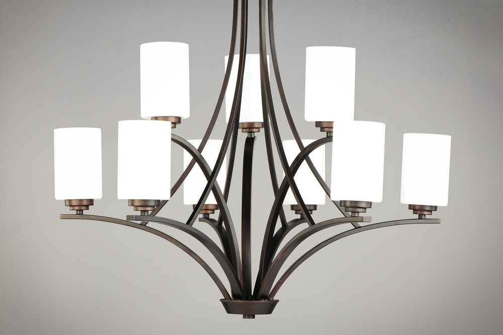 Low sloping arms of rectilinear tubing is finished in a variety of options that include Satin Nickel, Oil Rubbed Bronze, Matte Black, and a contemporary Satin Brass finish. Tall, cylindrical Satin White glass shades soften the light source within. Offered