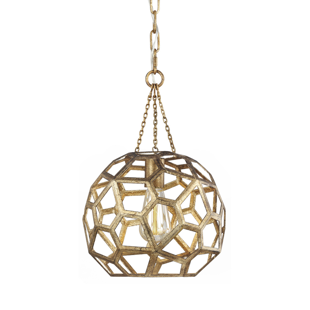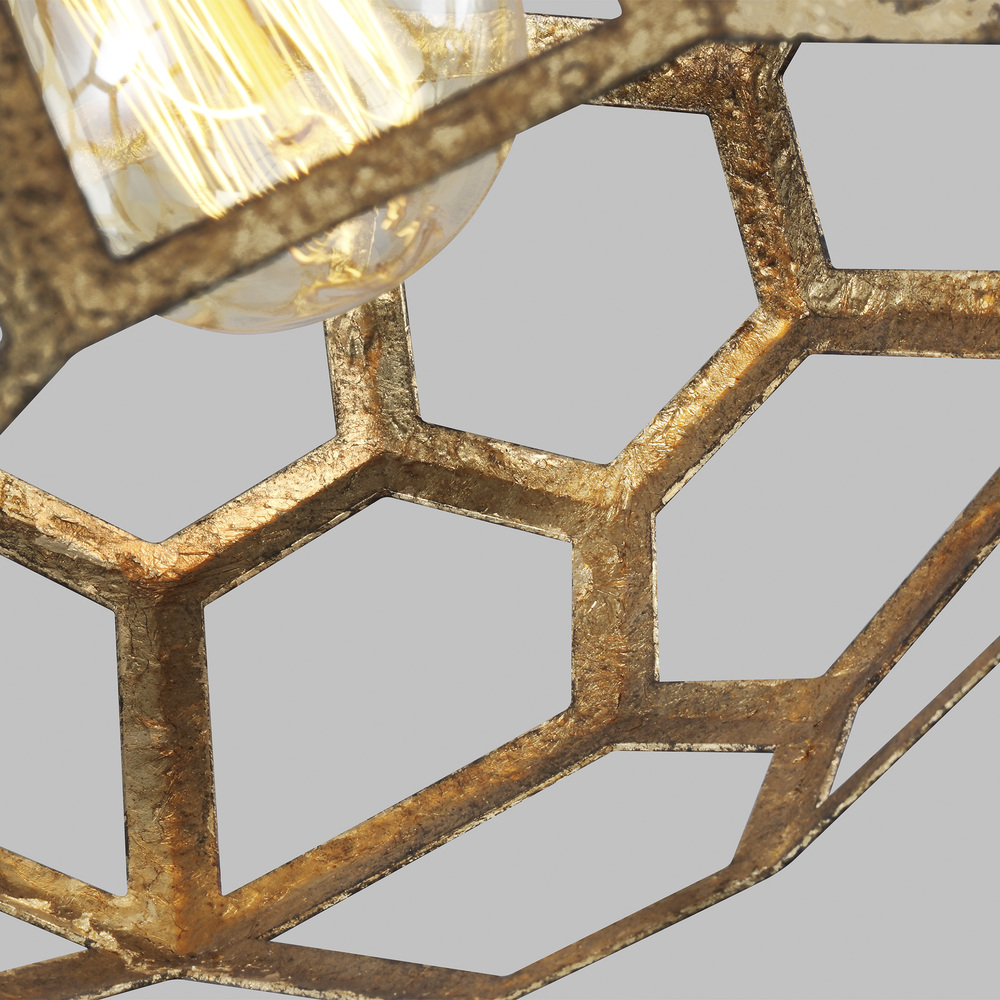 The Alexa Hampton Feccetta, one indoor light pendant in antique gild, is elegantly charming with a Mid-Century Modern appeal. The fixture is suspended by matching polished brass chain links, and three smaller chain links hold the shade and socket. The combination of its circular form with a hexagonal-shaped cut-out frame illuminates light from any choice of lamping. It can be elegantly placed as the focal point over an island or kitchen table. Alexa Hampton is an industry force that honors tradition and commits to the future, providing intelligent, stylish, design-rich solutions for every aspect of the home. Alexa Hampton Collections feature fresh takes on traditional looks, beautiful and unique hand-applied finishes, and stunning, thoughtful-inspired pieces.