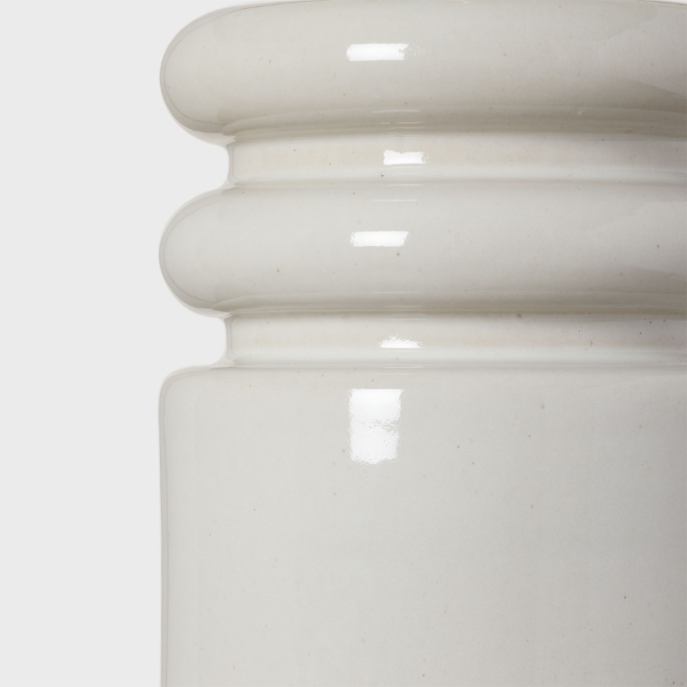 The Feikudo table lamp by Ellen DeGeneres is a stunning tribute to artisanal ceramics, blending handcrafted artistry with timeless design. Its cylindrical base features intricate carved details, brought to life by a crackle glaze that enhances its texture and character. Inspired by California's serene landscapes, the lamp's color palette harmoniously balances soft and bright neutrals, evoking a natural yet refined aesthetic. The Feikudo table lamp effortlessly combines modern sophistication with rustic charm, making it a versatile piece that can stand alone as a focal point on a credenza or desk, or be styled in pairs to frame a bed or sofa with elegance and symmetry.