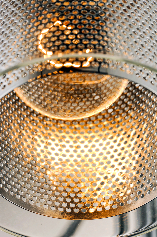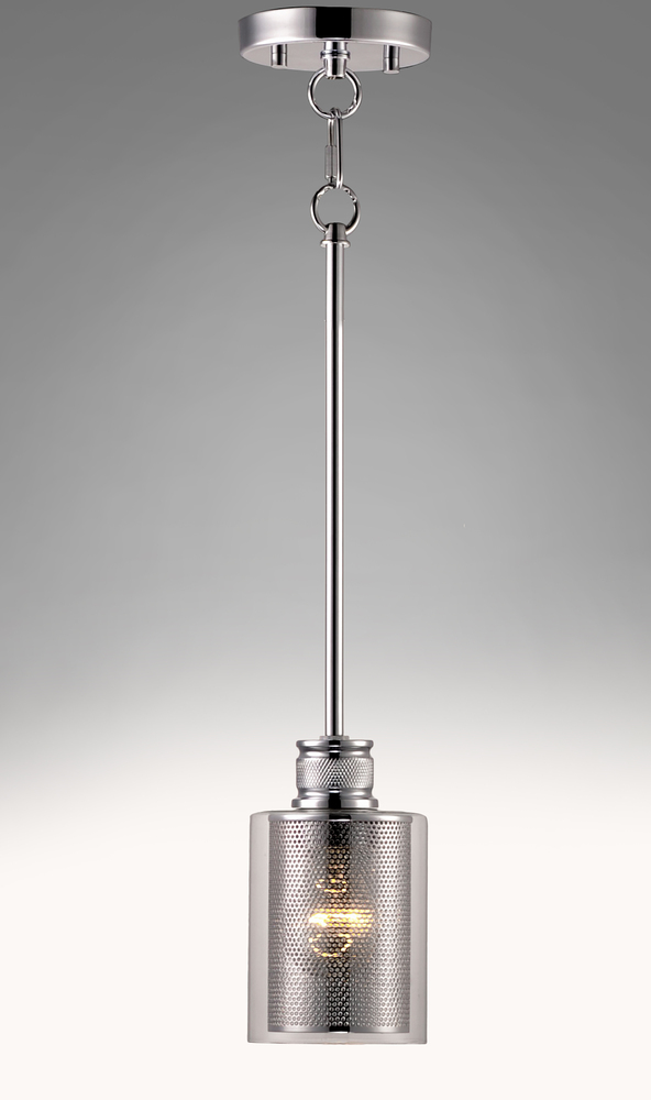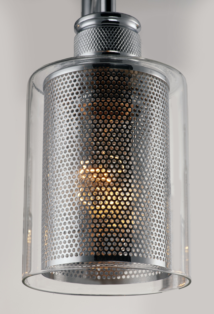 Clear glass cylinders lined with mesh screen are supported by knurled cups of Polished Chrome creates a contemporary design with an industrial twist. This economical collection provides a designer
