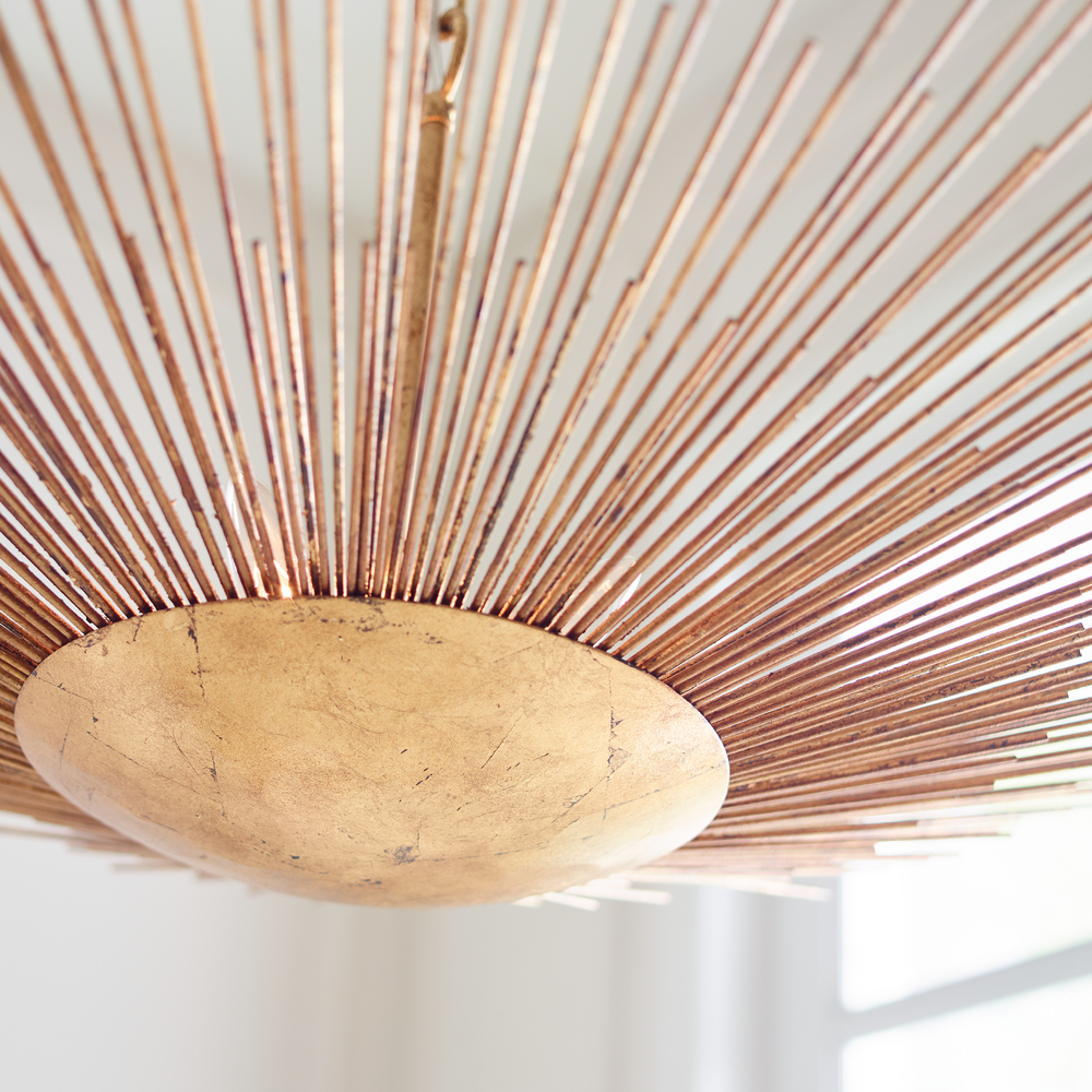 Named after the Greek God of the Sun, the Alexa Hampton Helios four light indoor pendant in Antique Gild is made with hand applied gold leaf and then hand distressed. This Mid-Century Modern fixture takes the shape of its name, with up-flowing stems resting elegantly on a round metal canopy with each metal rod hand cut and hand welded straw-like brass layers forming the shade of this textural fixture. The Helios flush mount features a dynamically cut, sun-like form and gilded iron finish. This stunning piece is an eruption of light and brings a stylish presence to any aspect of your space. The assortment includes a four-light wide pendant, six-light small pendant, eight-light tall pendant, three-light semi-flush and one-light pocket sconce. Alexa Hampton is an industry force who honors tradition and commits to the future, providing smart, stylish, design-rich solutions for every aspect of the home.
