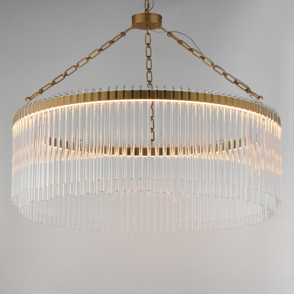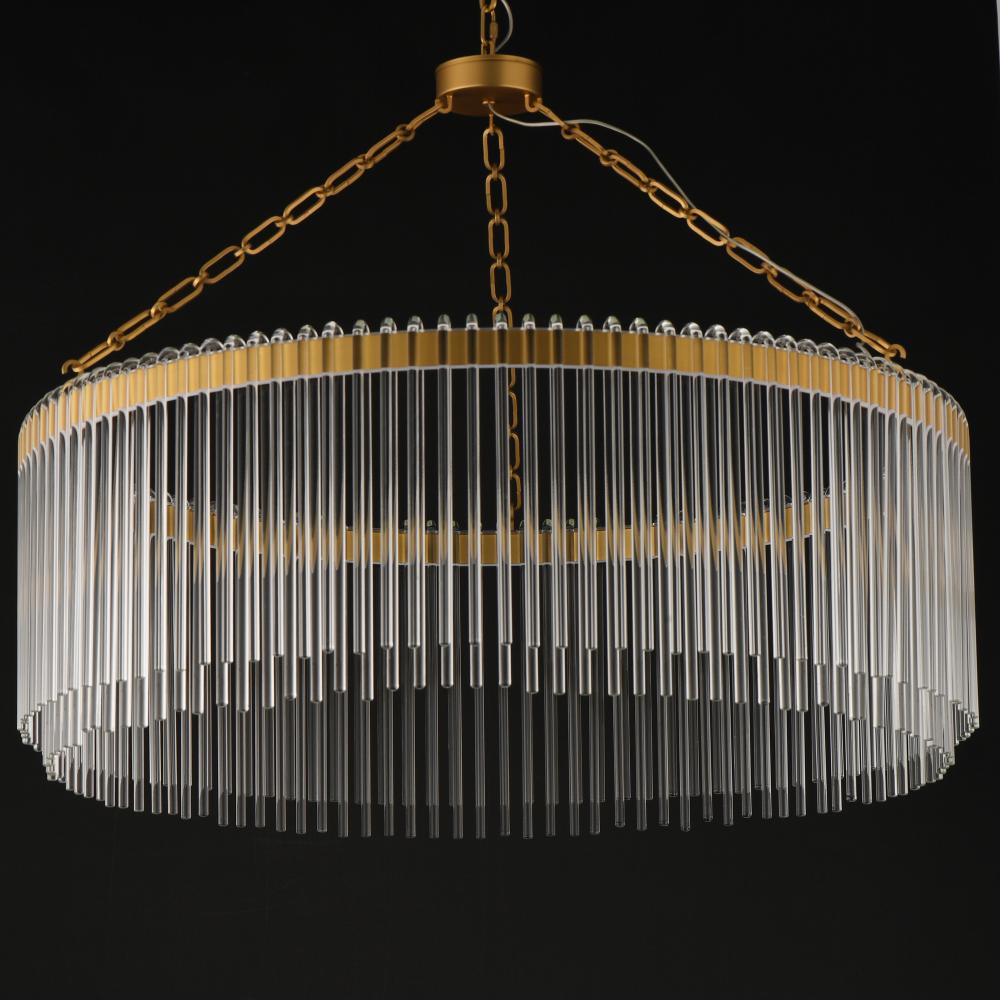 Clear glass rods elegantly curve to drape over a metal frame, encasing an integrated LED light source within. These ornamental glass rods form a luminous curtain, softly illuminated by the LEDs. The LED light source features an adjustable color temperature