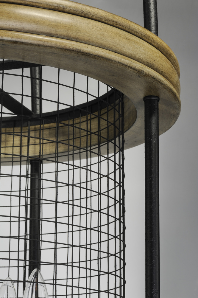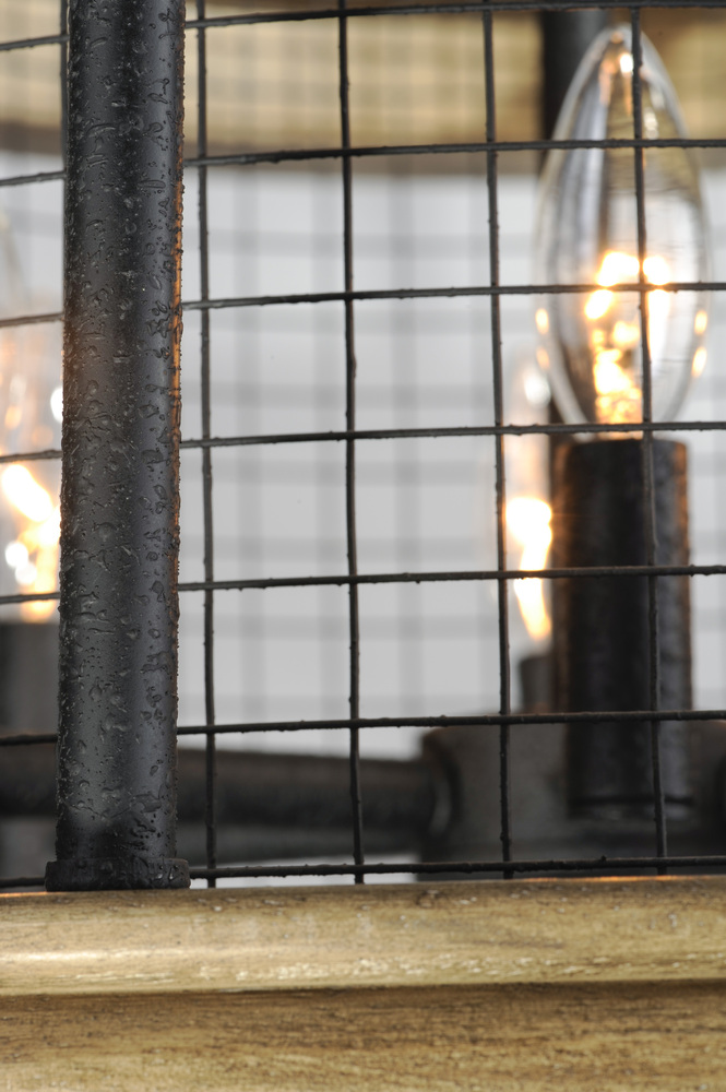 Rings of solid wood finished in Driftwood adds dramatic contrast to the Textured Black mesh and metal in this Industrial Country design. The use of mixed materials and textures create a striking design sure to enhance the beauty of your room.