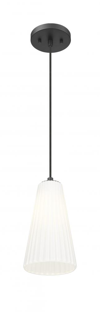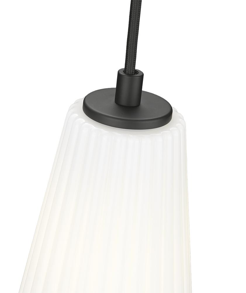 Introduce elegant character in your bedroom or living area with a modern one-light pendant. Its generous size creates bright, diffused illumination over any space as it shows off an elongated conical shade of fluted, frosted glass. Movement and texture epitomize this striking matte black finish fixture.