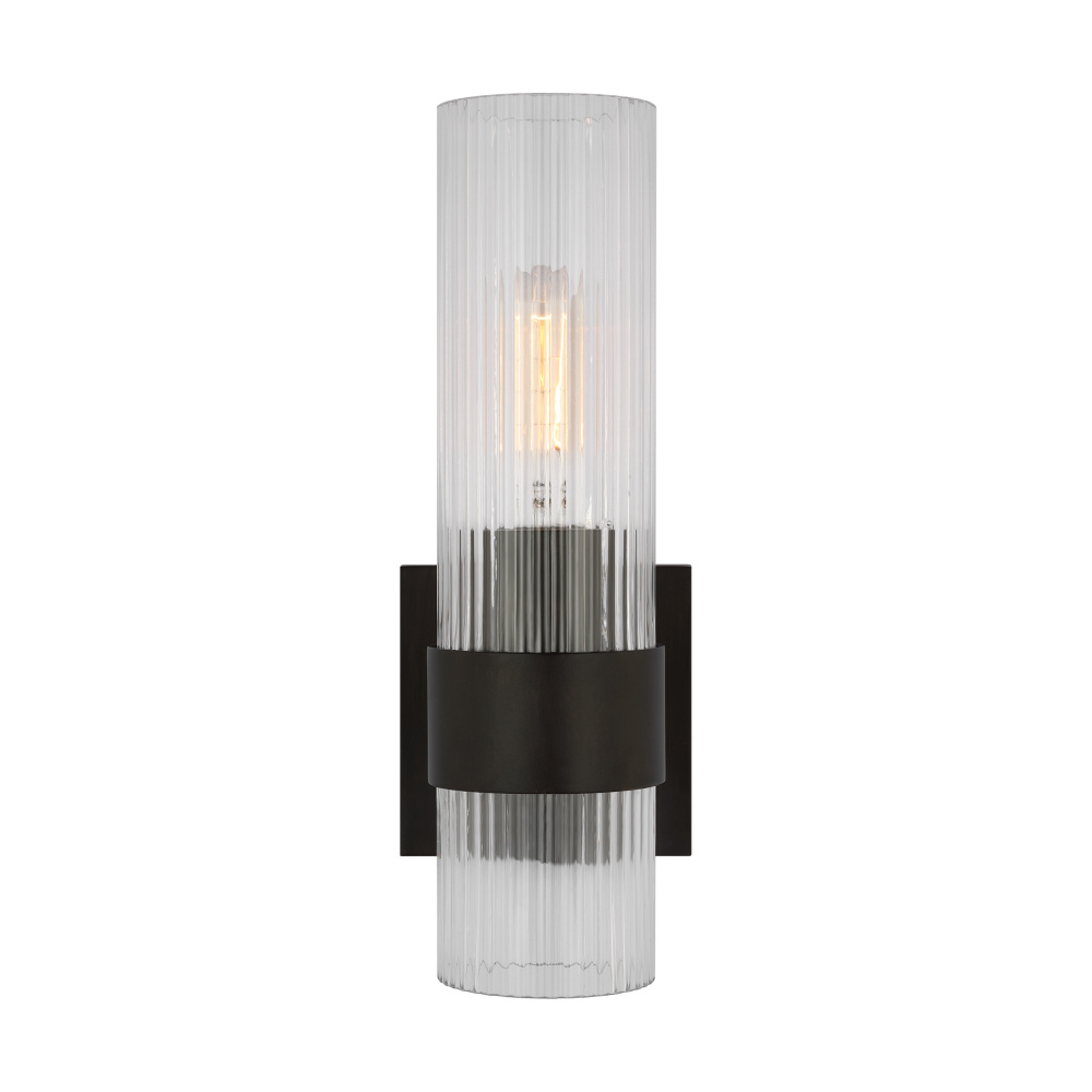 Designed by Chapman & Myers, the Geneva one light vanity fixture in Aged Iron is the perfect way to achieve your desired fashion or functional needs in your home. A fluted shade forms an elegant, dynamic silhouette balanced by a strong frame of Aged Iron, Burnished Brass, or Polished Nickel.
