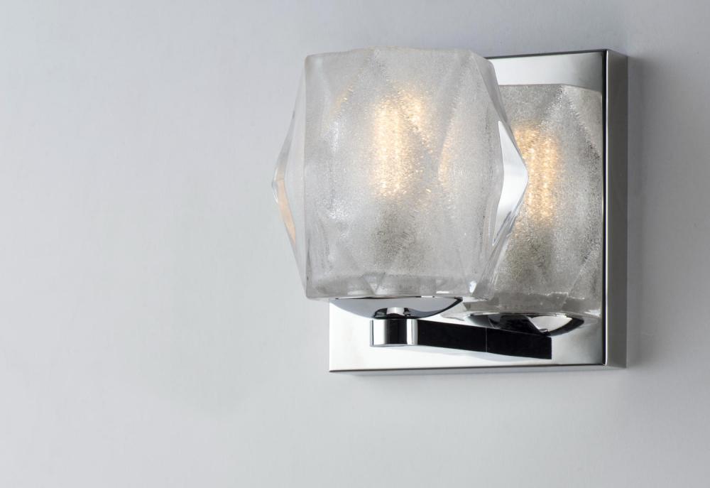 Faceted heavy glass of Clear Ice has a 3 dimensional illusion as well as a shimmering appearance when illuminated by high powered LED lamps included. Polished Chrome frames complete this sharp contemporary look in bath vanity lighting.