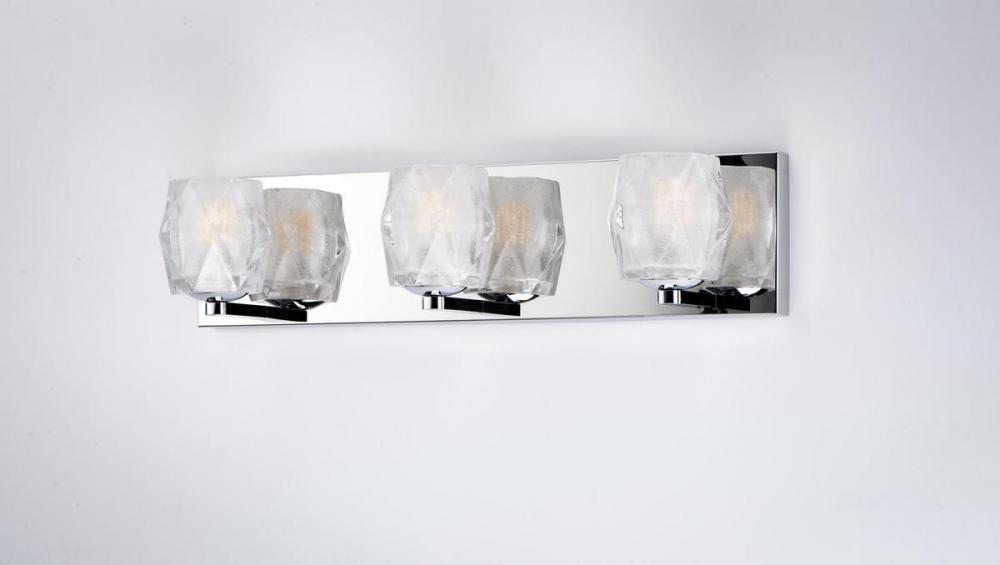 Faceted heavy glass of Clear Ice has a 3 dimensional illusion as well as a shimmering appearance when illuminated by high powered LED lamps included. Polished Chrome frames complete this sharp contemporary look in bath vanity lighting.
