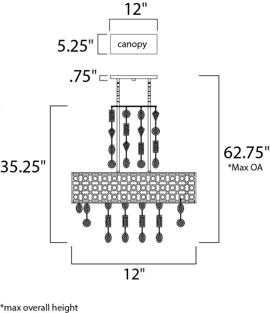 A geometric pattern in a frame of Stainless Steel finished in Polished Nickel is contrasted by an inner Slate fabric shade. Geometric shaped cast pendants frame custom-made crystals, adding brilliant accents throughout the fixture.