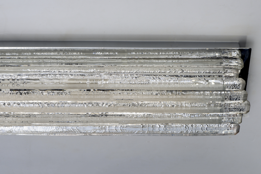 Hand formed Clear glass rods are mounted using various lengths to create this custom look. Installed on a frame of Polished Nickel this unique LED bath vanity has a very upscale appearance.