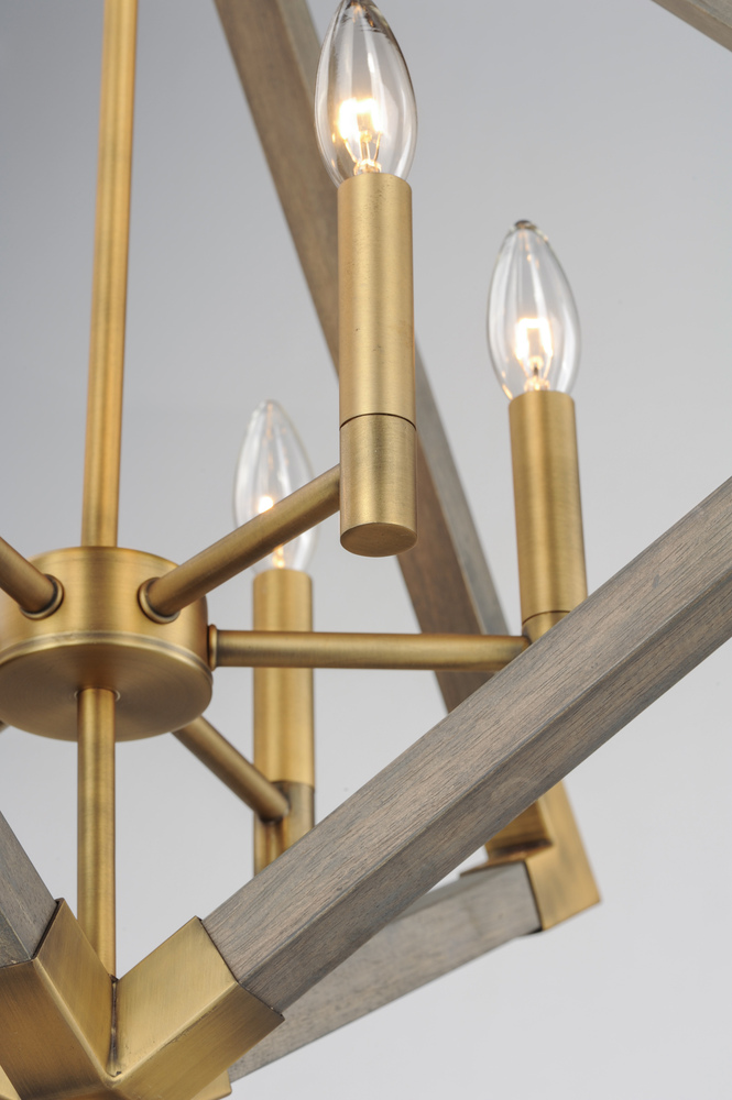 Prism shape pendants made of solid wood finished in Weathered Oak and trimmed with Antique Brass accents work beautifully over kitchen islands or dining tables. The contemporary shape and traditional finish demonstrate a transitional design that fits into