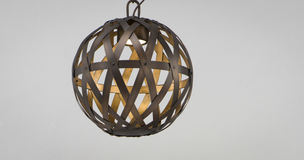Bands of metal are woven on a frame and finished in Bronze Gilt on the outside and a contrasting Gold Leaf finish on the inside. An LED light source peers through openings in the weave and directs light outward eliminating any strobing effect that fans may